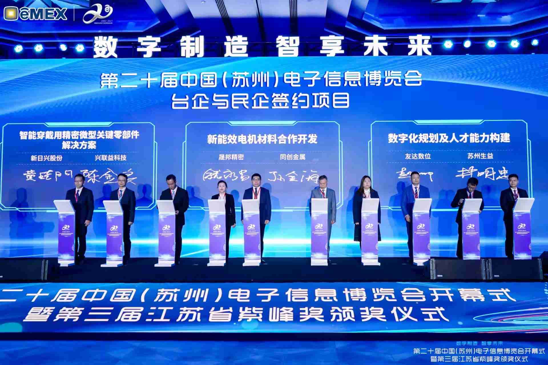 电博会开幕式当天也是第三届江苏省紫峰奖颁奖仪式,,,省台办、、工信厅、、商务厅、、、苏州市相关领导均出席并颁奖。。。该奖项为表彰对江苏高质量发展做出积极贡献的在苏企业,,,由江苏省政府专门设立。。JDB电子光电 (苏州) 总经理郭振明代表上台领奖,,这也是JDB电子苏州连续三次蝉联紫峰奖 出口贸易领军企业奖。。。JDB电子数位总经理赵丽娜女士,,,,也参与本次开幕式,,上台为本地化赋能签署战略合作协议,,将优质服务资源集合、、、下沉到更多细分行业,,,,为更多地区的制造企业提供数字化转型服务。。。