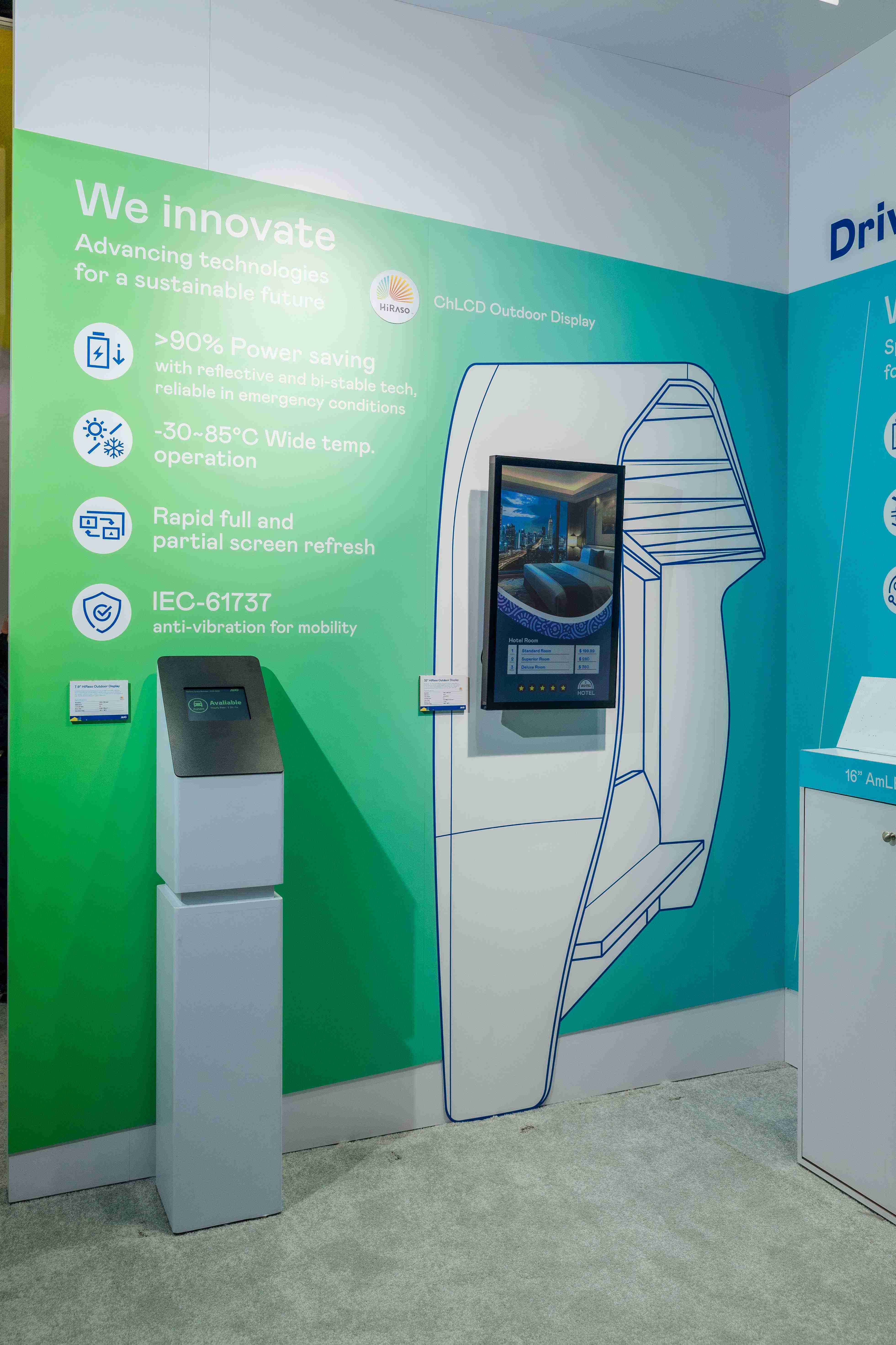 HiRaso胆固醇液晶显示器运用反射环境光线的方式,,,呈现影像显示时零耗能的环保省电诉求,,,光线愈强愈能呈现绝佳的色彩饱和度及显示效果,,,同时在摄氏-30度至85度间宽温的使用优势,,为户外电子看板的新首选。。