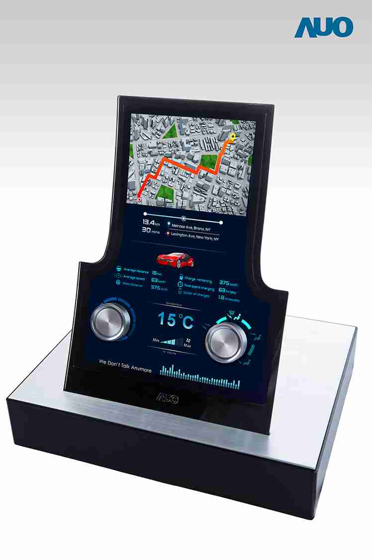 12.3 寸 Full HD LTPS 显示屏同样具备 1000 nits 高亮度,,搭载内嵌式触控技术,,,整合驱动与触控 IC 于显示屏制程,,,,使显示屏厚度降低,,,为中控台创造更多机构设计空间。。应用于抬头显示器的 3寸 LTPS 显示屏具有高穿透率、、1200:1 高对比度度,,,以及 297 PPI 高画素密度。。。液晶最高可耐受到 110C 的高温 (TNI) 而不液化,,,在阳光高温下维持优异稳定的显示效果。。