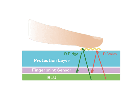 TFT 指纹扫描感测技术利用薄膜电晶体 (TFT) 当作光感测元件,,藉由非晶硅 (a-Si) 与低温多晶硅(LTPS)既有光电转换特性对不同波段光源进行吸收,,,使感测 IC 读取阵列感测元件的光漏电差异,,,转换成数位灰阶影像。。